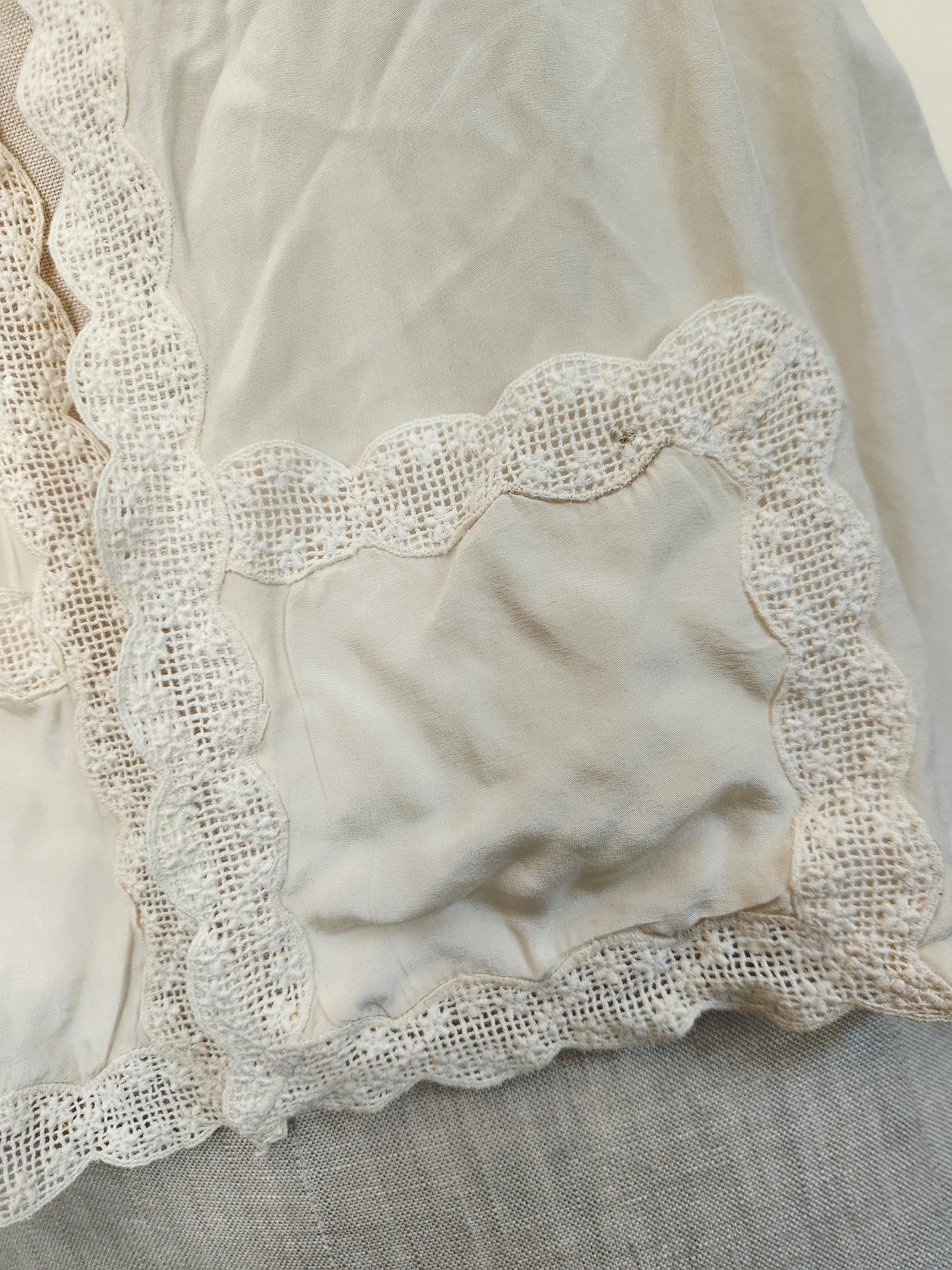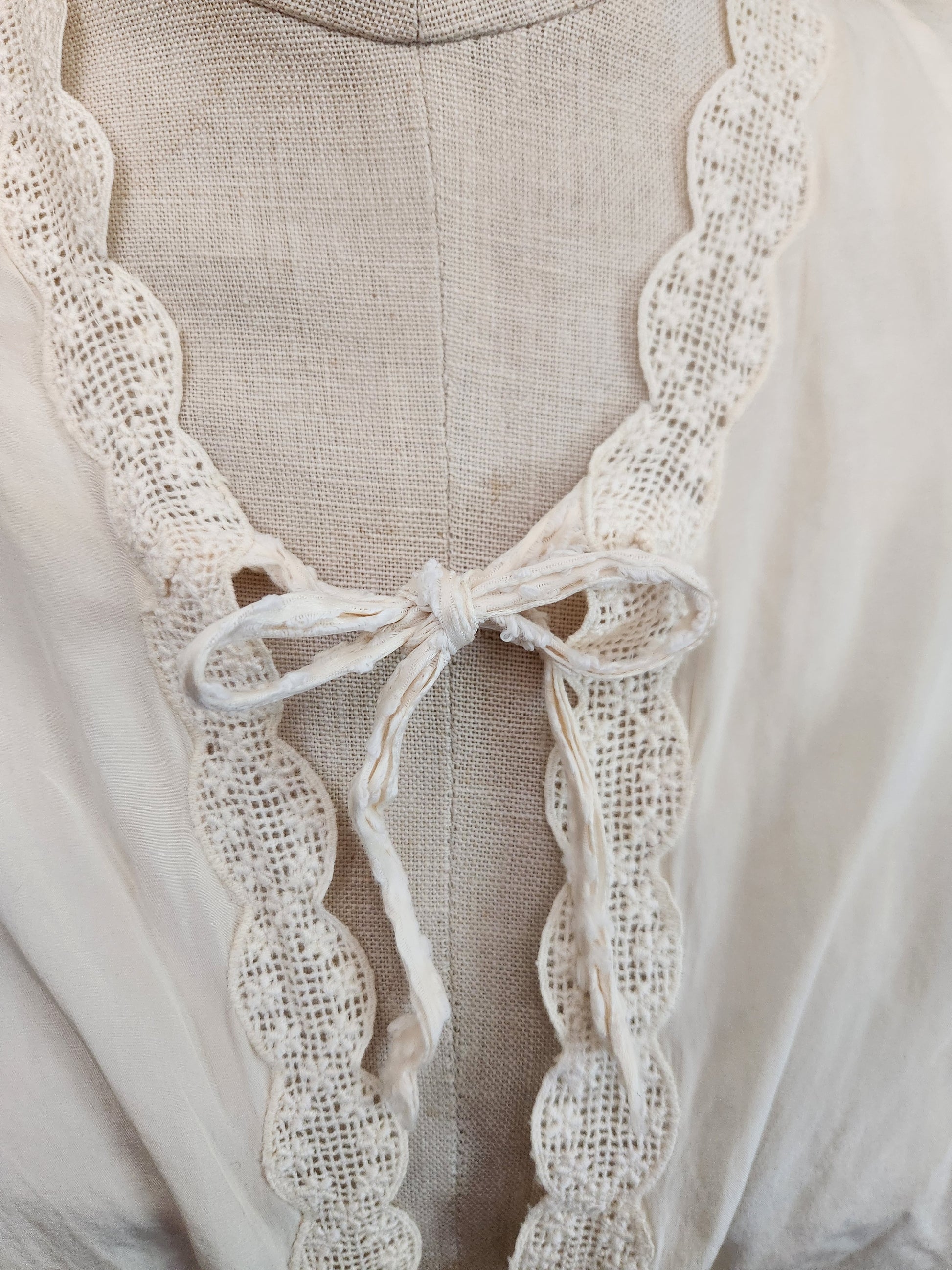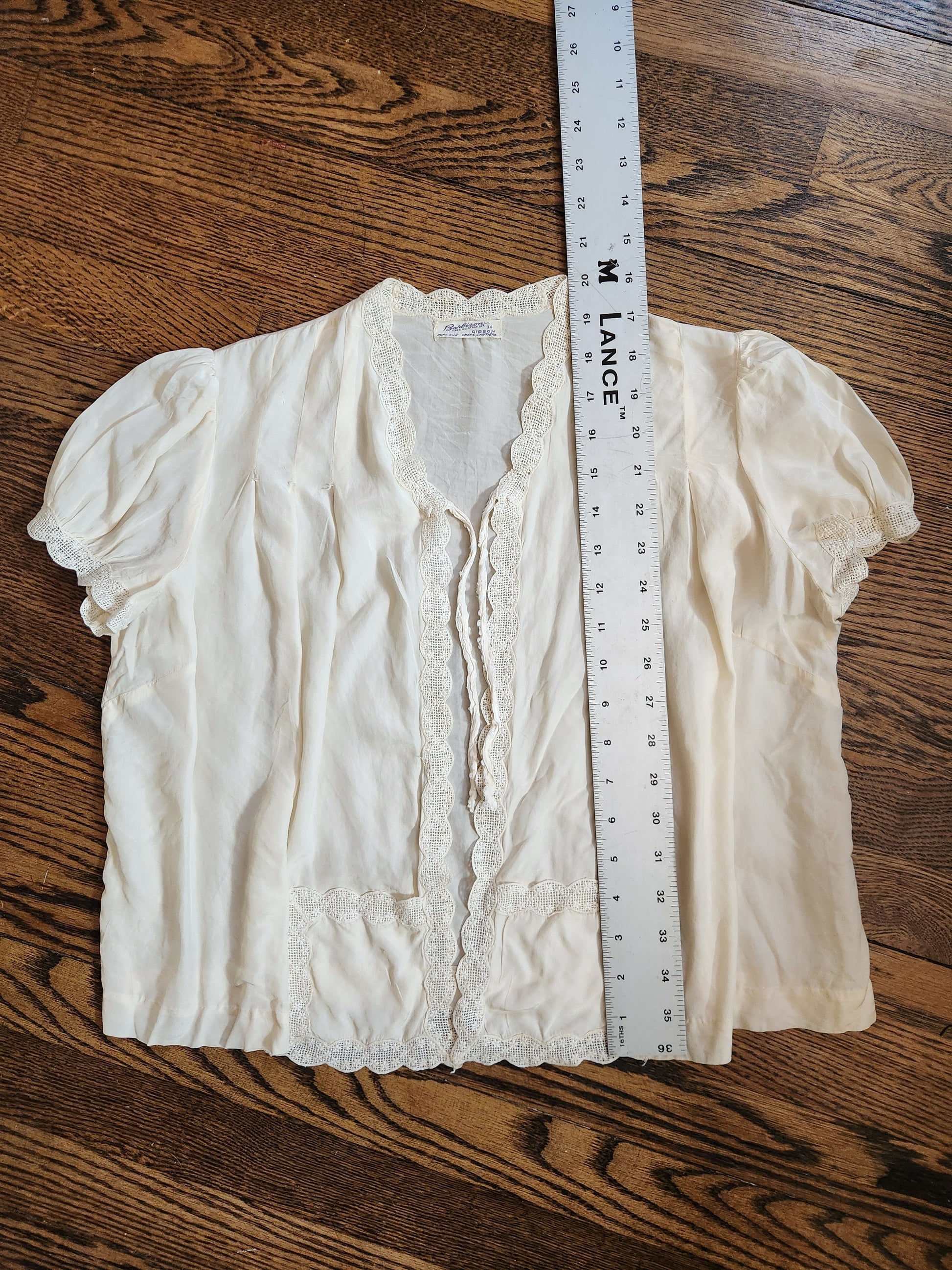 Gorgeous 1940s ivory silk bed jacket by Barbizon. This bed jacket has lace around the collar, down the front, and on the sleeve cuffs. It features short puffed sleeves, a silk tie closure, two little front patch pockets, and pleats by the shoulder.