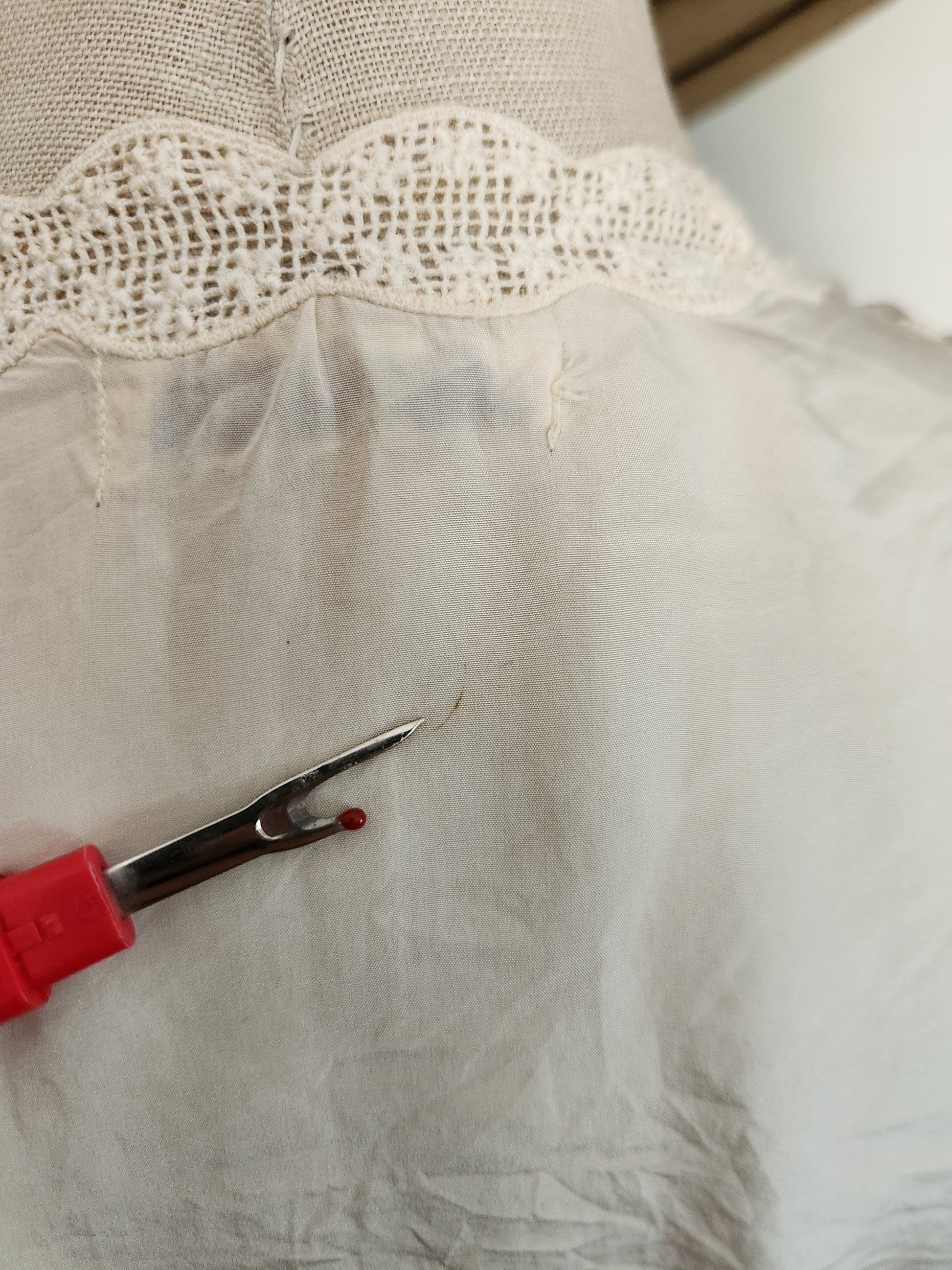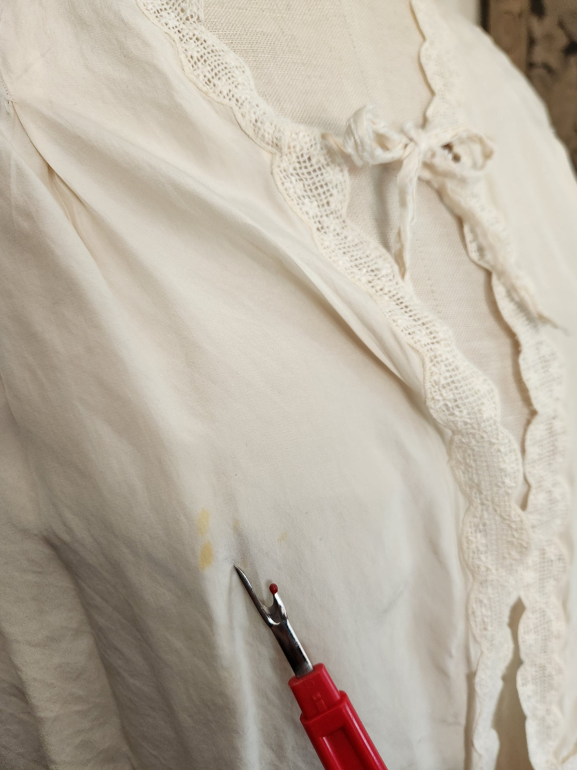 Because of this bed jacket's age, it does have a few marks and one small tear. There are photos of each. The tear is on the outside of one of the shoulder pleats. The silk felt fine while handling but does feel like it may be a bit fragile so delicate handling/wearing is recommended.