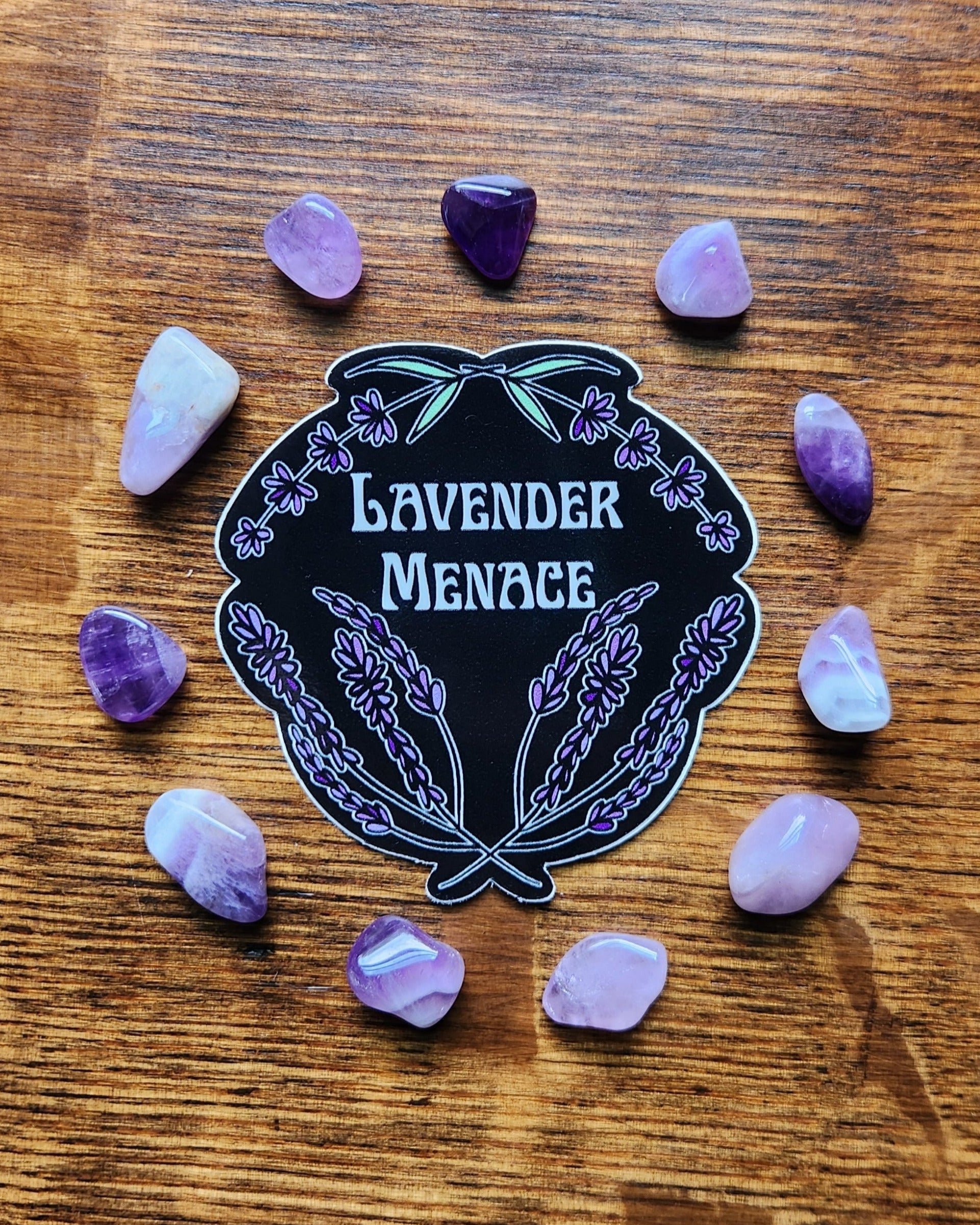 Black vinyl sticker with sprigs of lavender and white text reading "Lavender Menace"