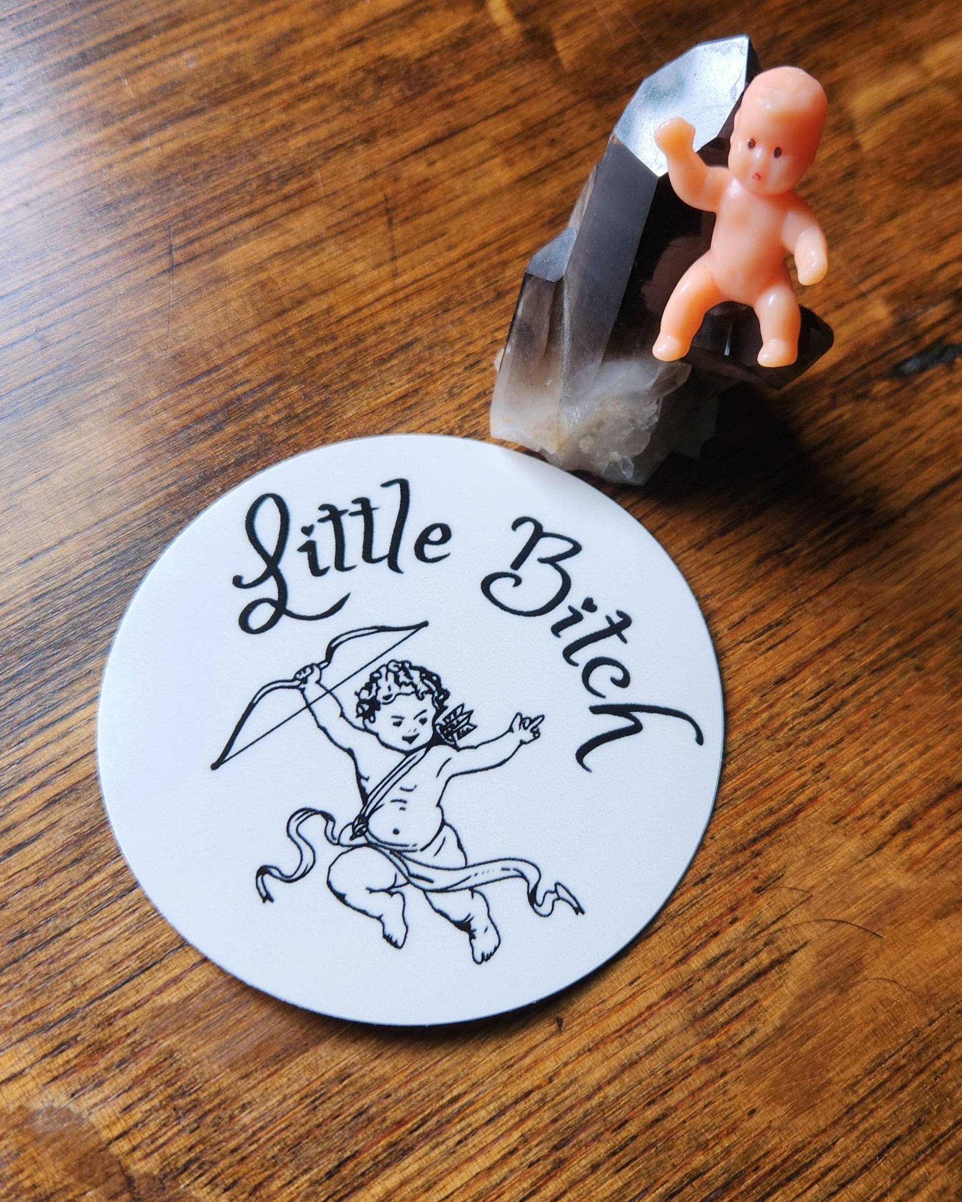 Cream color circular sticker reading "Little Bitch" with cupid (or is that my nephew?) flipping the bird while holding a bow aloft in sinister triumph.