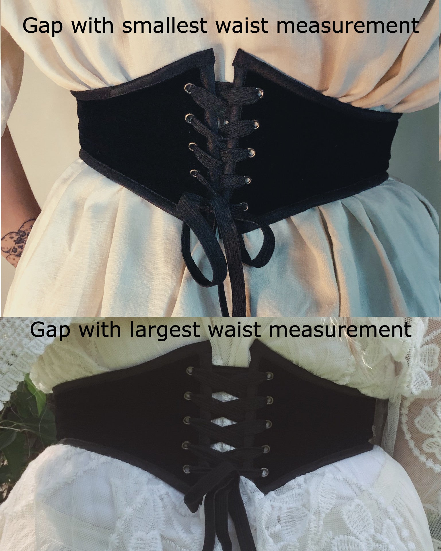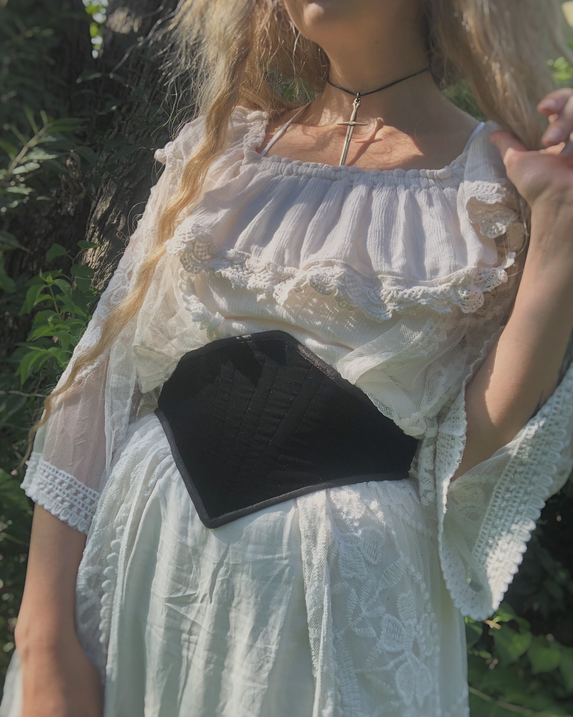 The Wormwood belt is a corset style belt made from luxurious black velvet, giving it the deepest black color and a lush texture. This belt is based on 19th century "Swiss waist" belts which were decorative belts, or sometimes bodice-like accessories meant to be worn on the outside of your clothing. They were particularly popular in the 1860s. This is a great way to fancy up an outfit or change its silhouette.